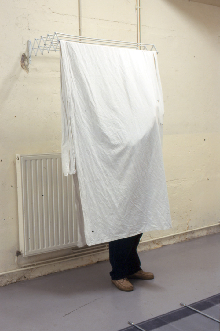So we go to see the person with whom we slept in the sheet. But she is not in. We force open the door. We want to leave something personal behind, to say we are still alive, but are unable to find words to express it. So we put the plug in the sink and turn on the tap, and let the water run until it overflows onto the floor. We splash about a bit, and then leave.